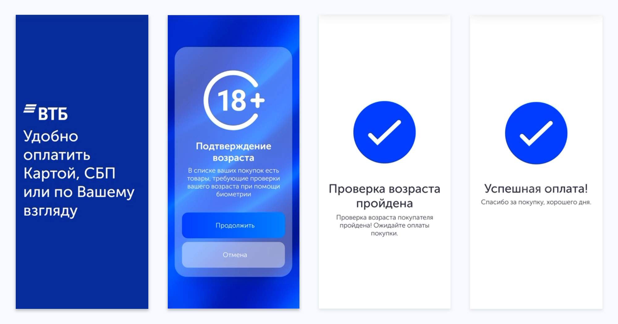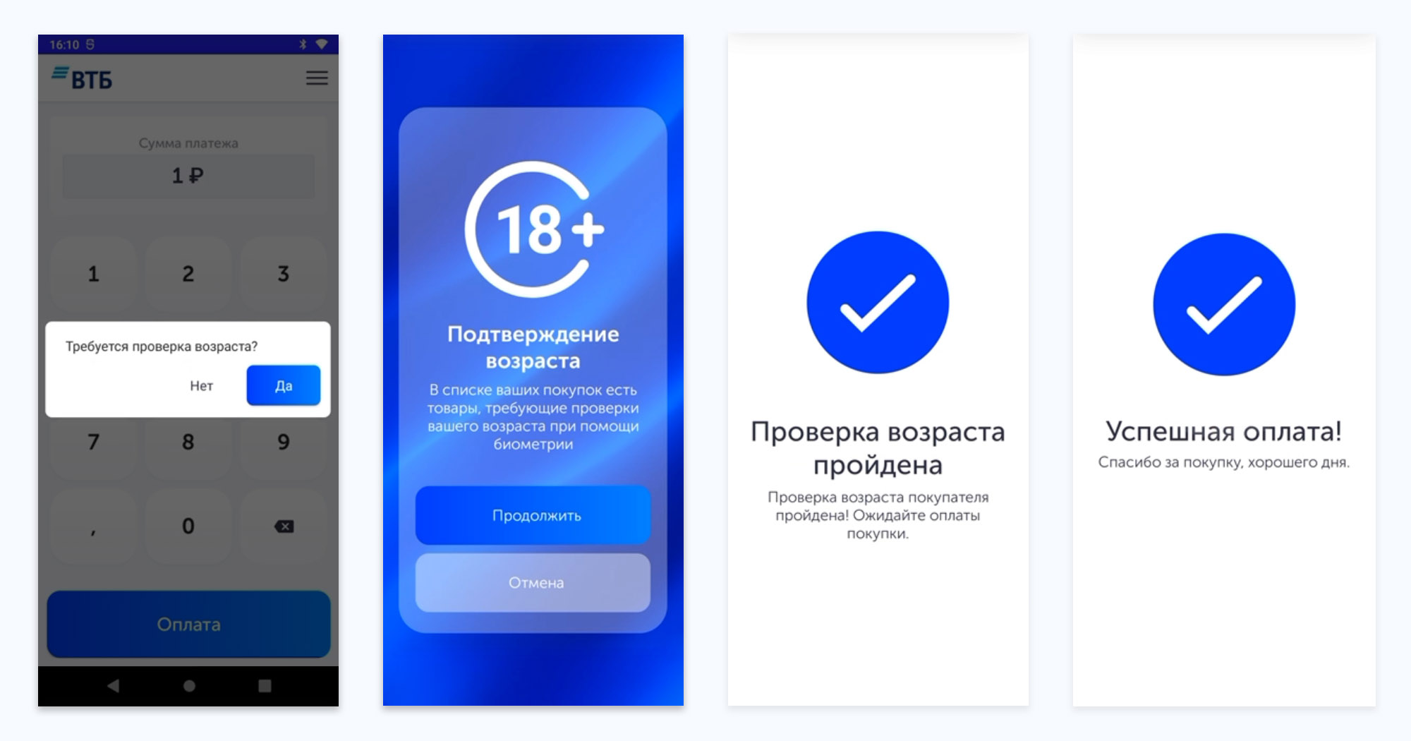 На стенде ВТБ терминал работах в режиме интеграции с кассовым ПО. С компьютера, на котором установлено кассовое ПО уходил запрос в терминал, и если среди продаваемых товаров был товар требующий подтверждения возраста, то запускалась целевая схема подтверждения возраста. Сначала, на экране, пользователю предлагалось дать согласие на биометрическую проверку возраста. Если согласие было получено, терминал производил проверку возраста. Если возраст покупателя соответствовал требованиях, то терминал производил оплату при помощи биометрии. В противном случае выводил информацию о том, что возраст покупателя не соответствует требованию.